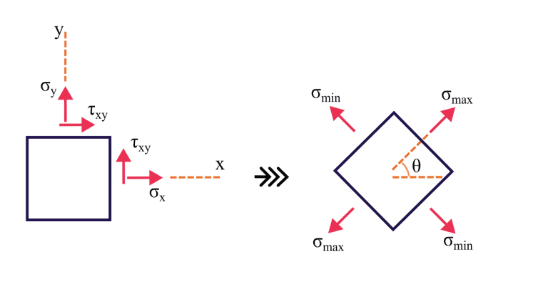 If an element in a plane is subjected to normal stresses of ($\sigma_{x}$) and ($\sigma_{y}$) and a shear stress of ($\tau_{xy}$) and the element would be rotated arbitrarily, the normal and shear stresses change depending on the degree of rotation ($\theta$) as shown in Figure-1: